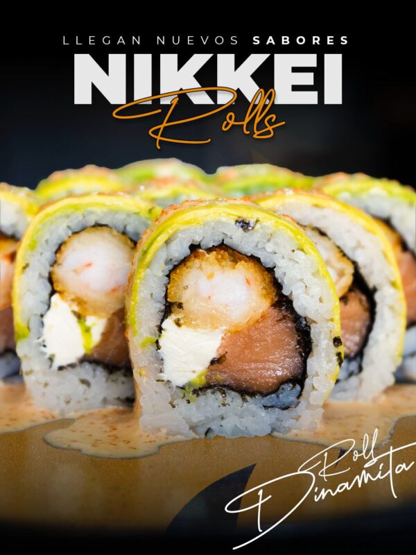 Camarón furay, queso, salmón. Envuelto en palta, con salsa dinamita.