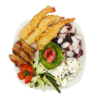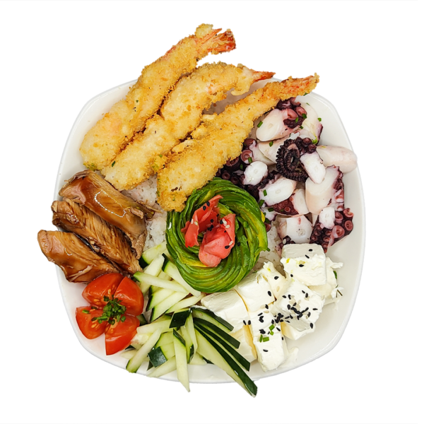 Cama de arroz, camaraon ecuatoriano furay, pollo tery, flor de palta hass, jengibre en escabeche, pulpo, vegetales y queso en cubitos